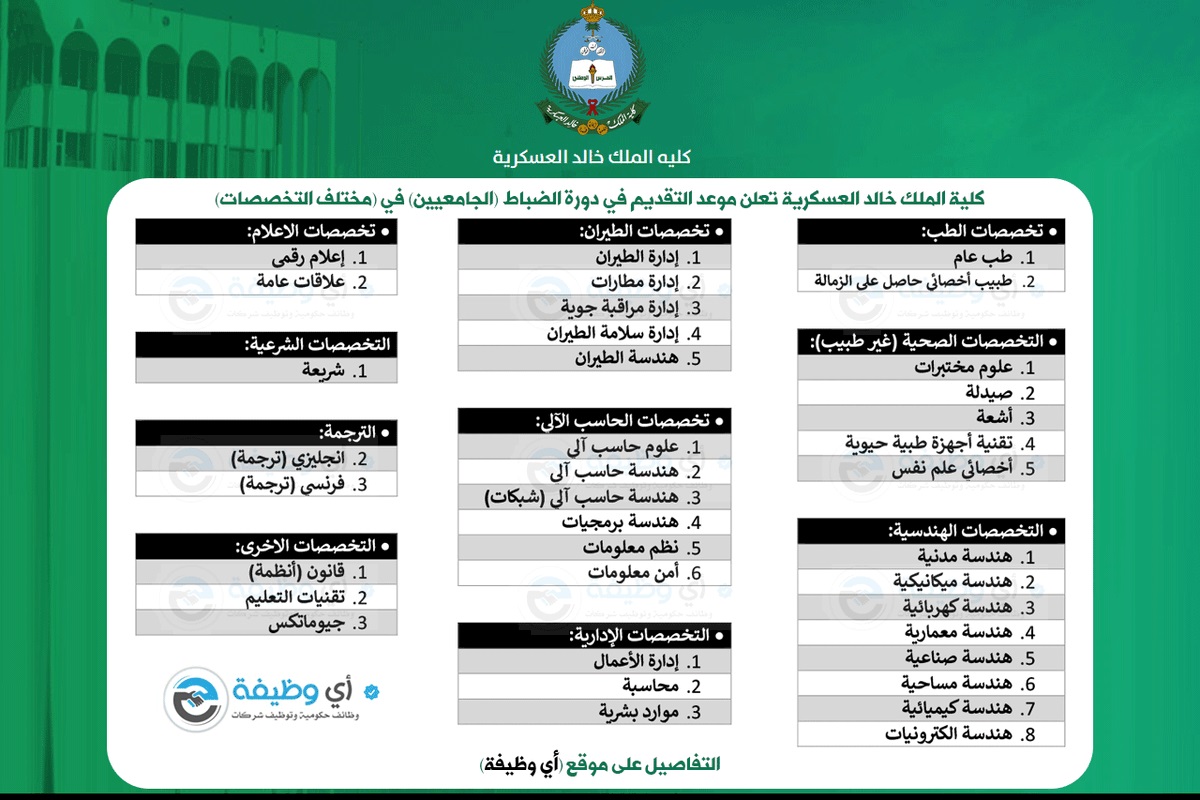 أعلنت كلية الملك خالد العسكرية مُمثلة في لجنة القبول والتسجيل بوزارة الحرس الوطني عن دورة الضباط للجامعيين وفتح القبول لحملة الثانوية.