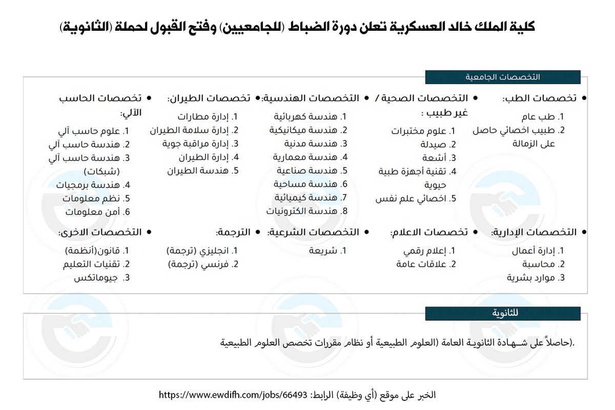 أعلنت كلية الملك خالد العسكرية ممثلة في لجنة القبول والتسجيل بوزارة الحرس الوطني عن دورة الضباط للجامعيين وفتح القبول لحملة الثانوية .