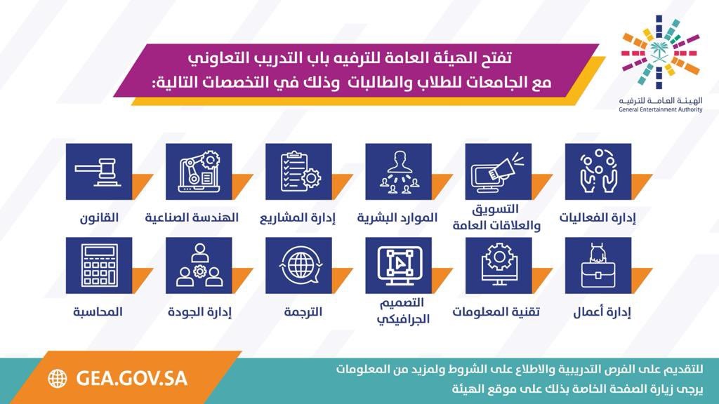 أعلنت الهيئة العامة للترفيه عن فتح باب التسجيل في برنامج التدريب التعاوني بمدينة الرياض لعام 2021م لطلاب وطالبات الجامعات في 12 تخصص .