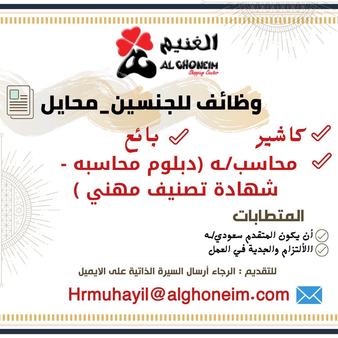 أعلنت شركة الغنيم المحدودة عن توفر وظائف شاغرة للجنسين للعمل في محايل عسير وذلك حسب التفاصيل الموضحة أدناه: