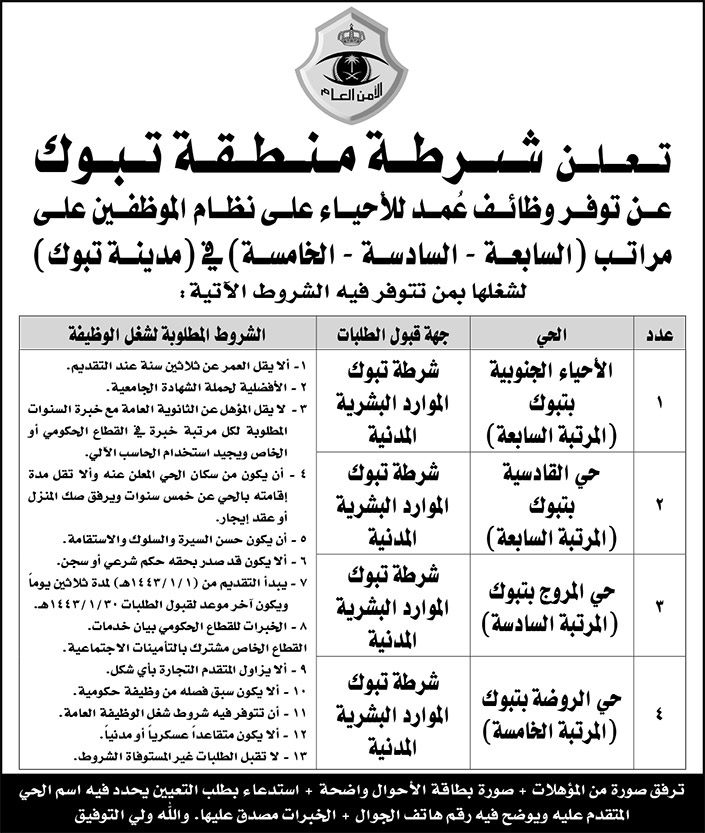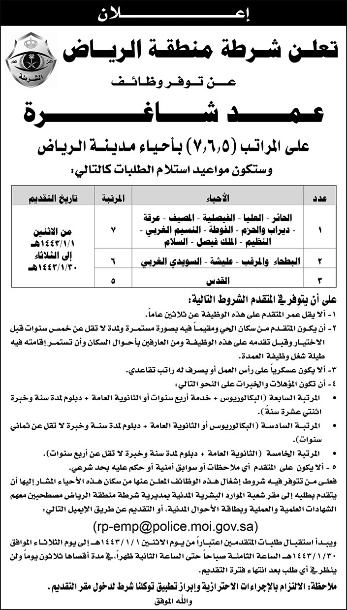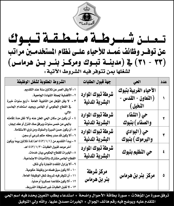 أعلنت شرطة منطقة الرياض وتبوك عن توفر وظائف عمد للأحياء على نظام الموظفين على مراتب السابعة – السادسة – الخامسة وعلى نظام المستخدمين مراتب 33 – 31 في تبوك ومركز بئر بن هرماس .