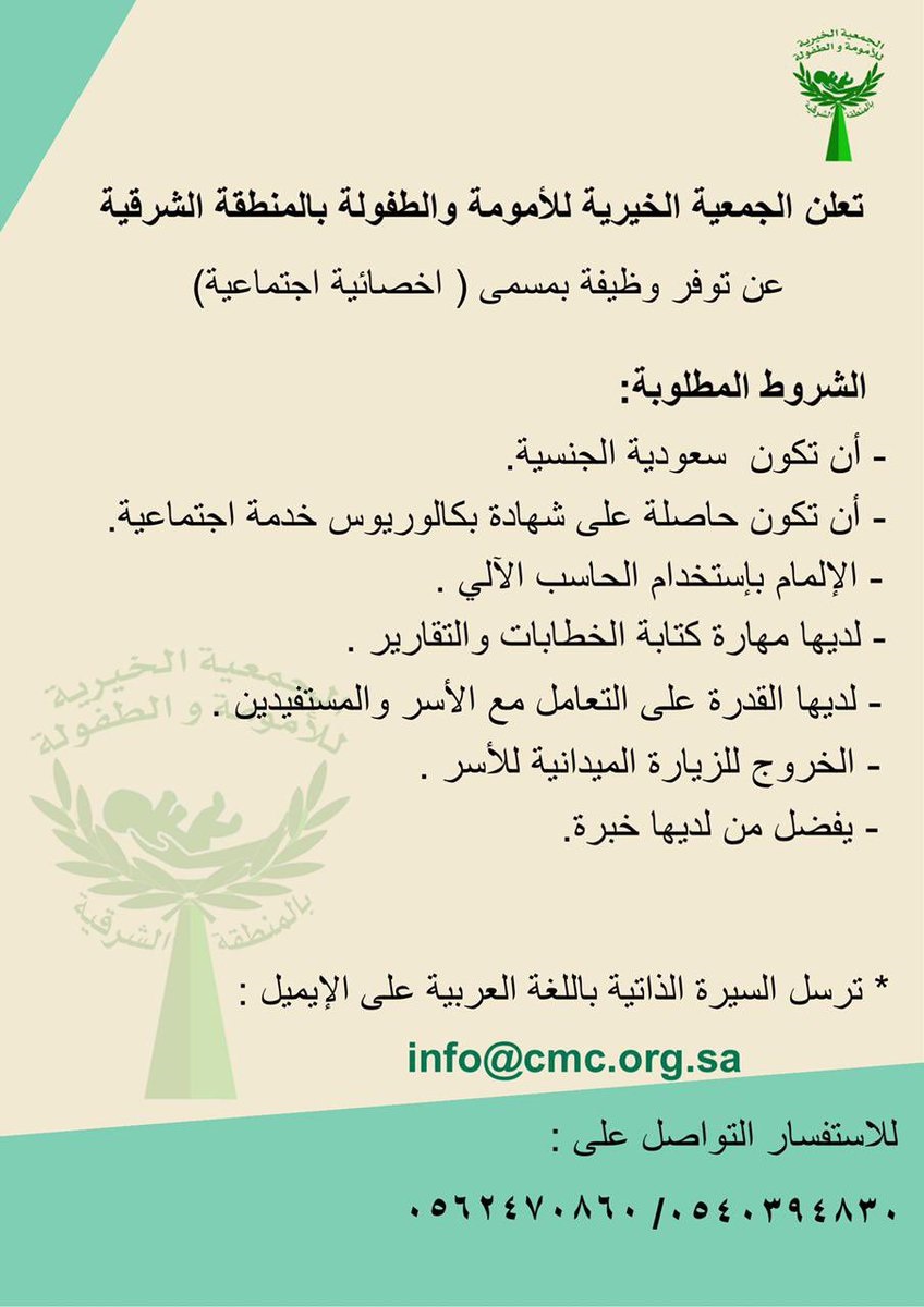 وظيفة في تخصص خدمة اجتماعية لدى الجمعية الخيرية للأمومة والطفولة بالخبر